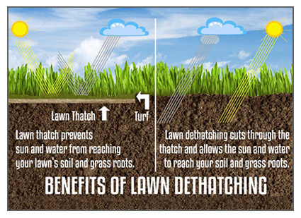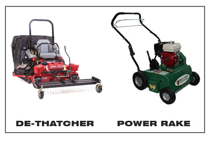 - Power raking and dethatching essentially do the same thing to your lawn but one is more aggressive than the other. Power raking is done with a gas powered machine with slicing blades that cut into the top layer of soil to remove thatch and debris. This is the most aggressive form of removing thatch from a lawn and is only needed on lawns with a severe thatch problem or lawns that are being renovated. Power raking deep cleans the lawn but can leave the turf stressed for a few weeks after having this service done. De-Thatching is done with a tine rake de-thatcher that is mounted to the front of one of our commercial mowers. We use this tine rake de-thatcher to remove thatch, embedded leaves and debris. The tines lift thatch without damaging healthy turfgrass and at the same time comb matted grass giving the lawn a clean, hand-raked appearance. De-thatching is much gentler on the turf than a power raking but still does an excellent job of removing thatch and debris while making the appearance of the lawn look great after a long winter! De-thatching is one of our most popular services we offer!